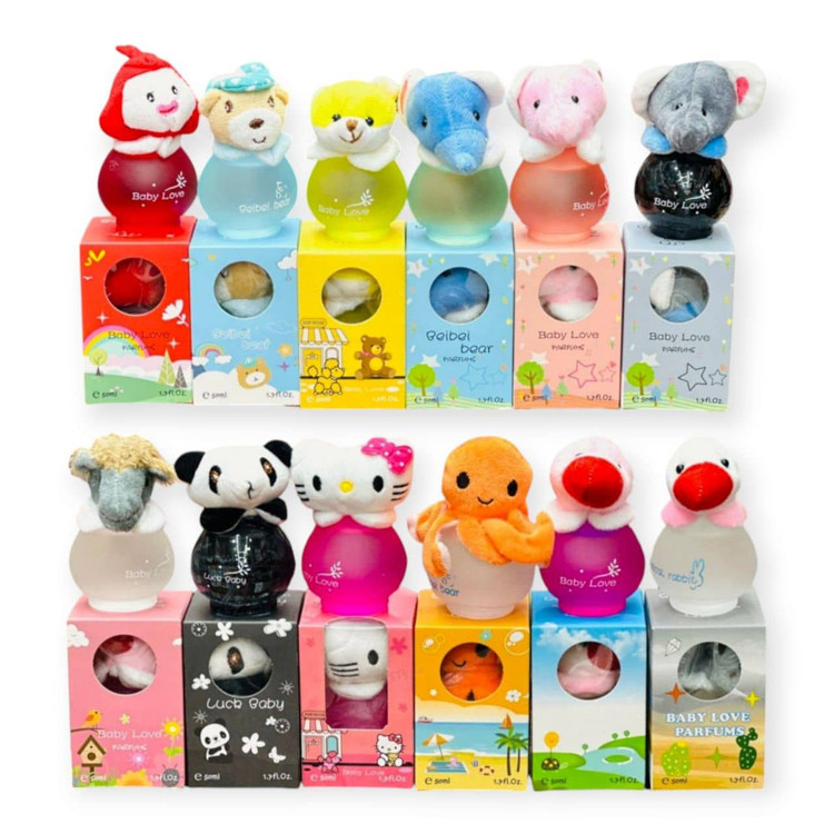 شیشه با طرح حیوانات که بچه ها خیلی دوستشان دارند تولید شده است درب شیشه این عطر بچگانه بیبی لاو همان طور که از اسمش پیداست به شکل یک عروسک طراحی شده که از جنس عروسک های پولیشی هستند و درب هر عطر به شکل زیبایی شبیه یک حیوان هست که در ادکلن عروسکی درب به همان شکل با نمک طراحی شده.