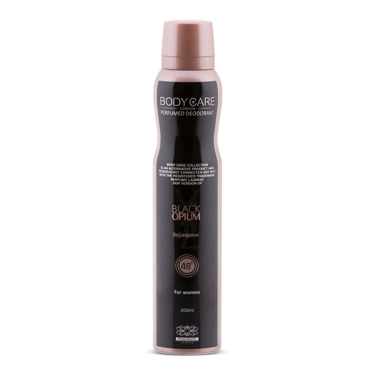 اسپری خوشبو کننده بدن زنانه بادی کر مدل بلک اوپیوم که برگرفته از ادکلن Yves Saint Laurent Black opium می باشد دارای رایحه گرم و تند می باشدکه بسیار زنانه و جذاب است. تم رایحه ای این محصول کلاسیک با هایلایت هایی از آکوردهای تلخ و ترکیبی جادویی انتخاب بی نظیری برای طرفداران این رایحه می باشد . ترکیب آن شامل نت های تلخی از قهوه ، تندی فلفل صورتی ، شیرینی گل یاس و گلابی و گرمای وانیل است که بر روی بیسی از نعناع هندی و سدر استوارند . از مشخصه های ممتاز آن رایحه ی غالب وانیل و ترکیب آن با تلخی قهوه است.