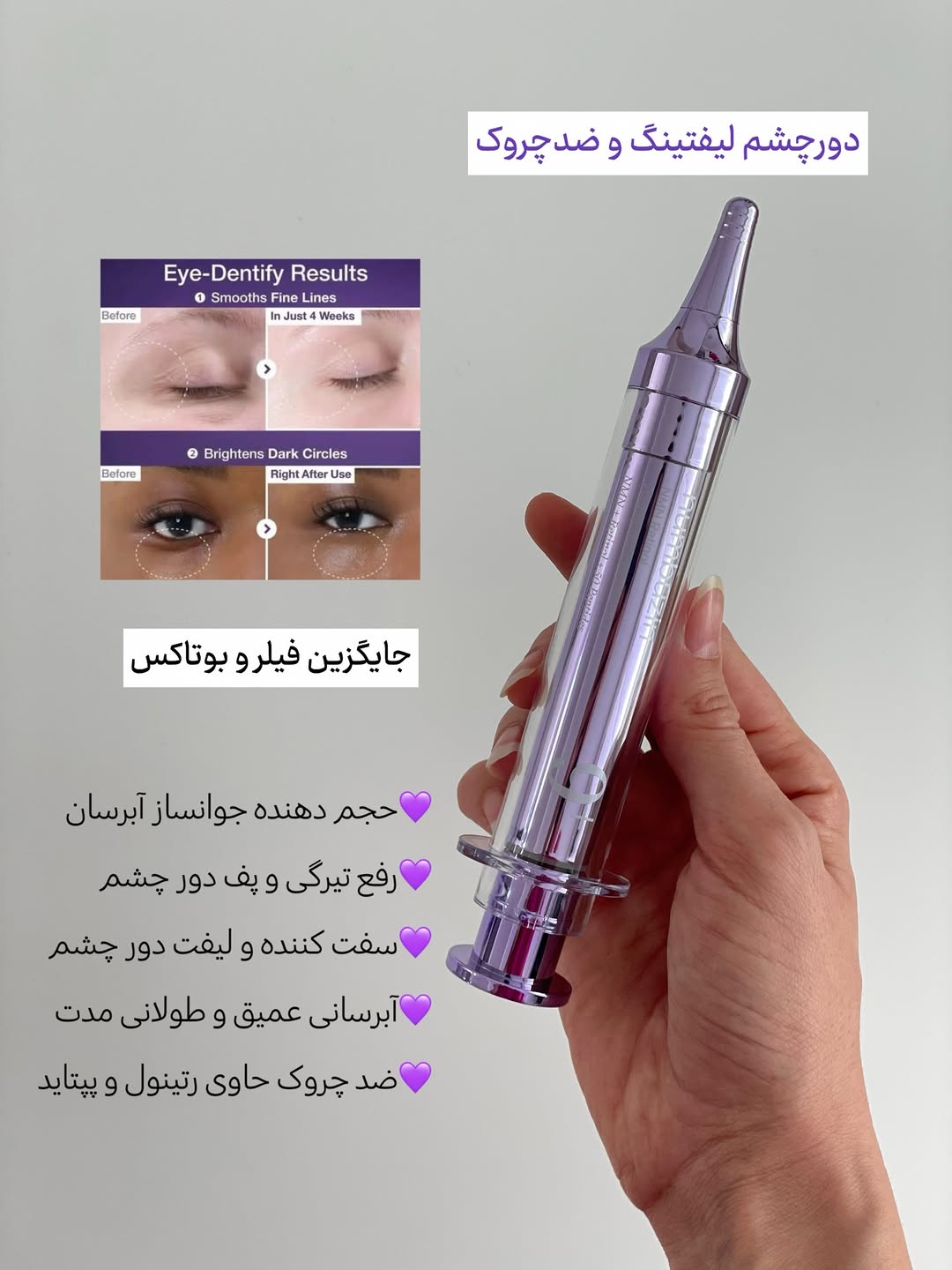 با فرمولاسیونی پیشرفته، به کاهش خطوط ریز، چین و چروک، تیرگی و افتادگی پوست اطراف چشم کمک کرده و ظاهر آن را روشنتر، سفتتر و جوانتر میسازد. رتینول به افزایش تولید کلاژن کمک کرده، سرعت بازسازی سلولی را بالا میبرد و به صاف شدن خطوط ریز و چین و چروکها کمک میکند.