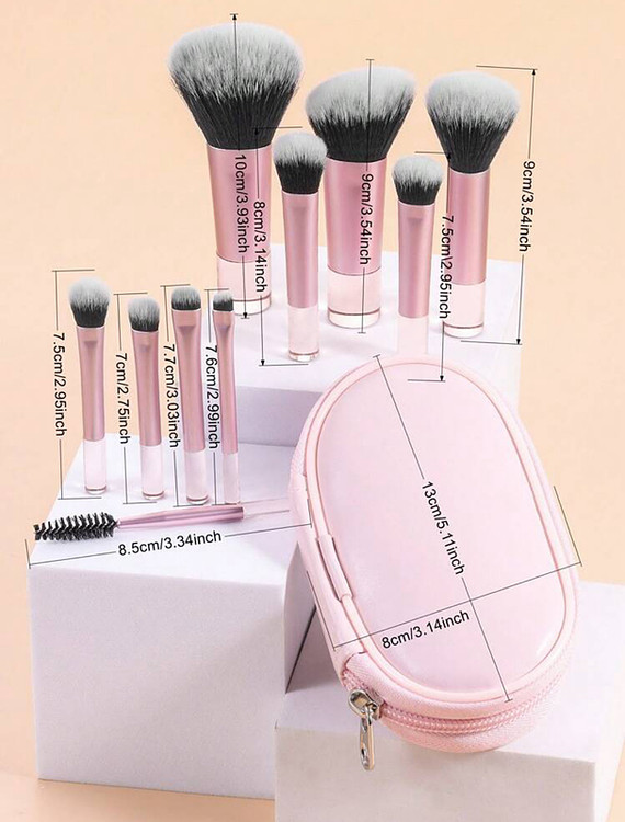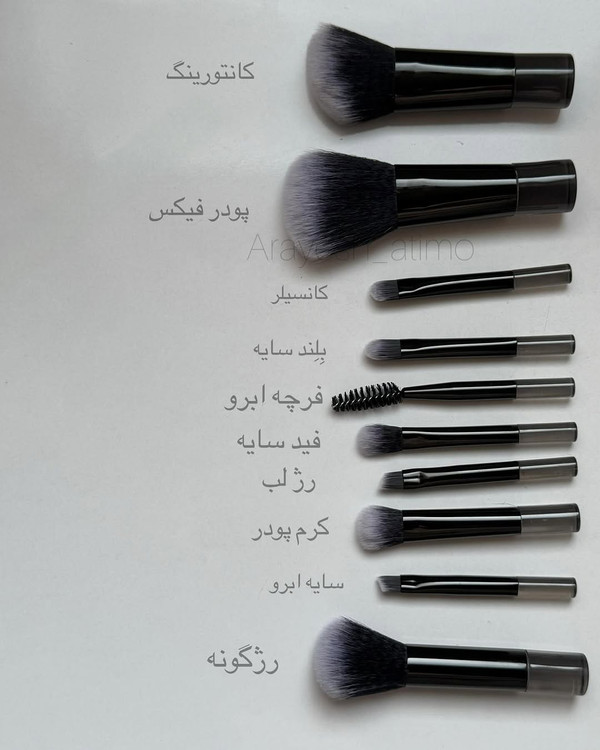 شامل یک کیف مسافرتی و 10 براش برای استفاده با کانسیلر، کرم پودر، رژگونه، کانتور، سایه چشم، پنکیک ، پودر فیکس و یک اسپولی برای ابرو و مژه است .